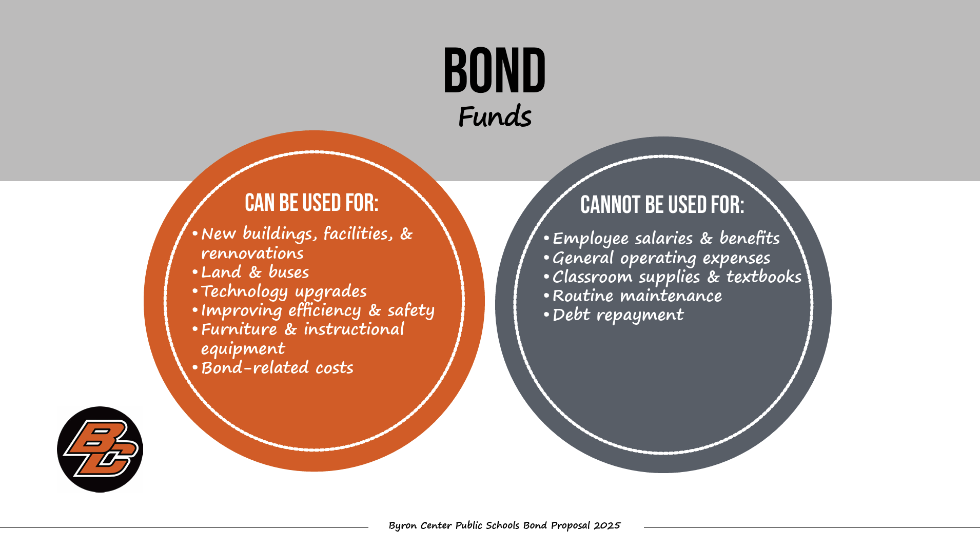 Bond funds cannot be used for operational expenses such as employee salaries and benefits, school supplies and textbooks.