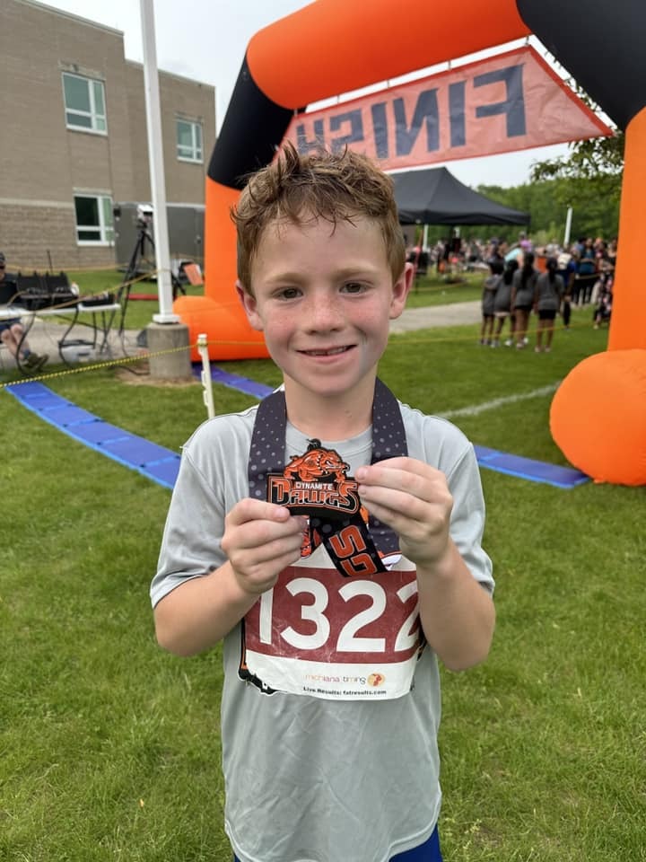 A Brown Elementary student shows off his medal after crossing the finish line at the 2024 Dynamite Dawgs run.