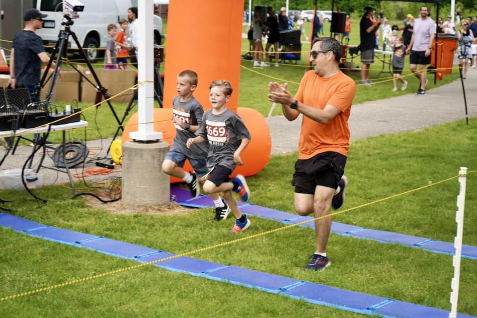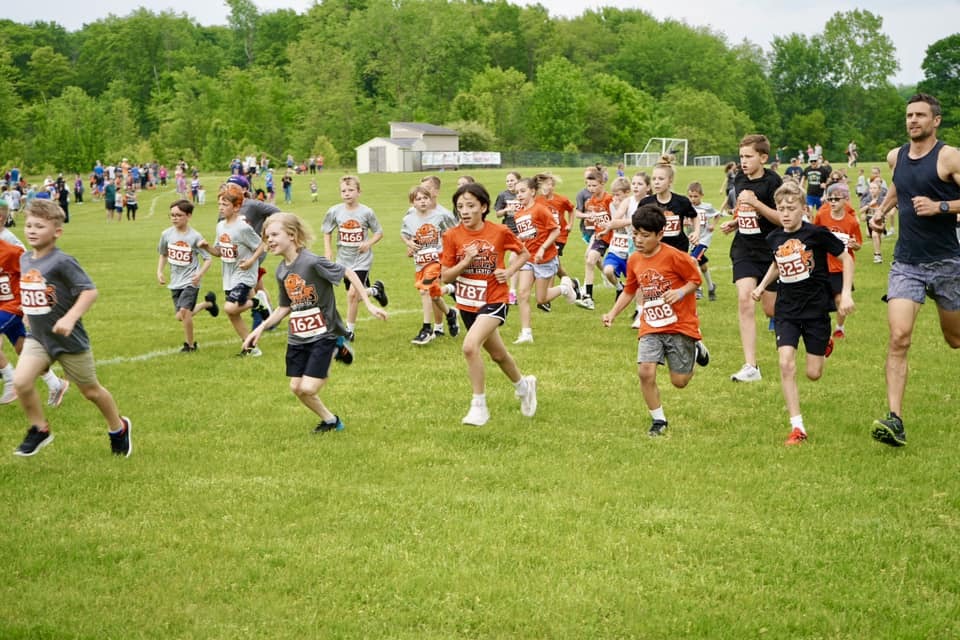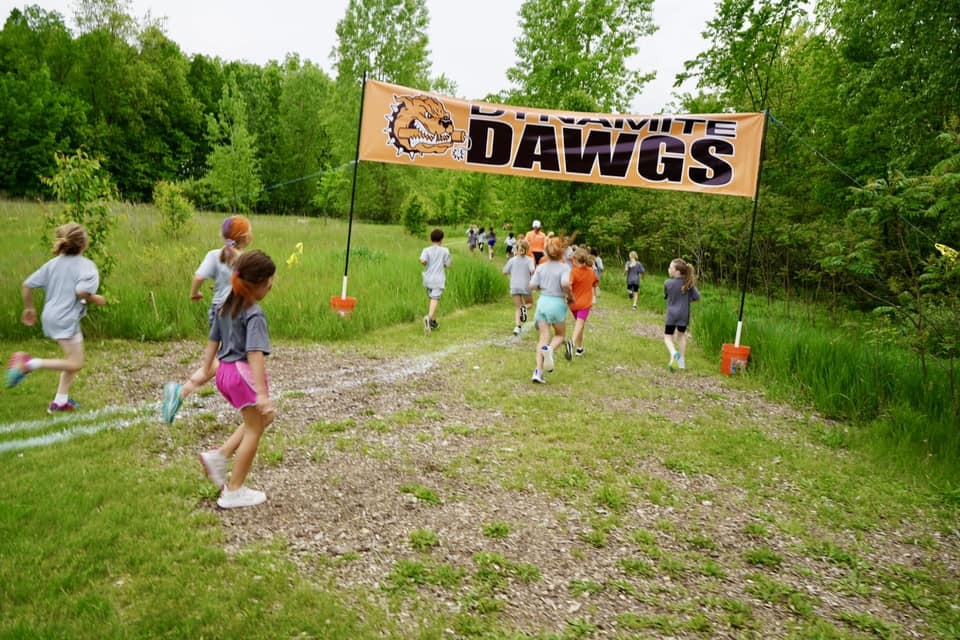 Countryside Elementary students cross the finish line at the 2024 Dynamite Dawgs run.