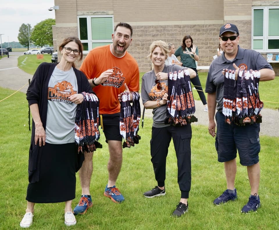 Brown Elementary Principal Gina Middaugh, Marshall Elementary Principal Kris Vydareny, Countryside Elementary Principal Cindy Viveen and BOE Member Nathan Jeruzal hand out medals to students crossing the finish line at the 2024 Dynamite Dawgs run.