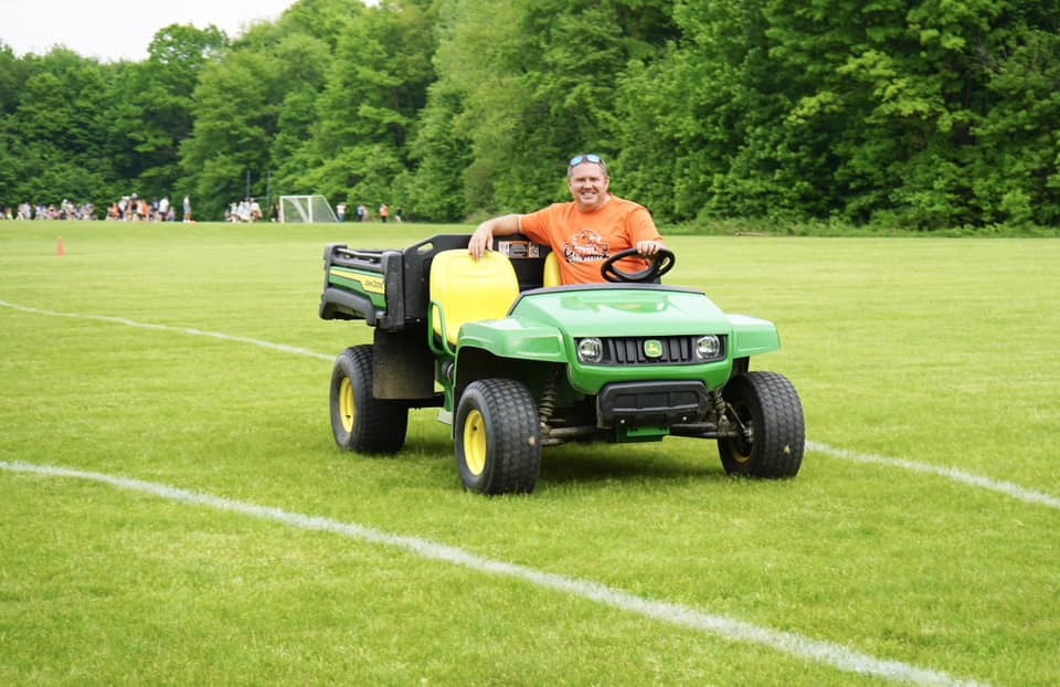 2024 Dynamite Dawgs organizer, Cross Country coach and Technology Director Russ Gerbers leads students through the course on a golf cart at the 2024 Dynamite Dawgs run.