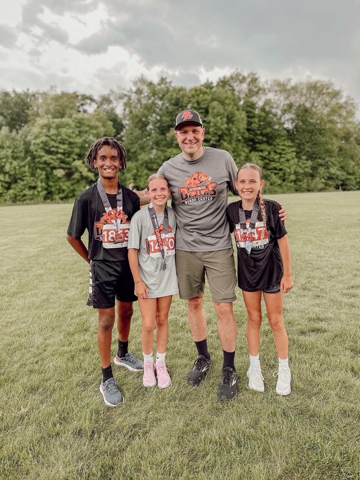 Superintendent Kevin Macina with students at the 2024 Dynamite Dawgs run.