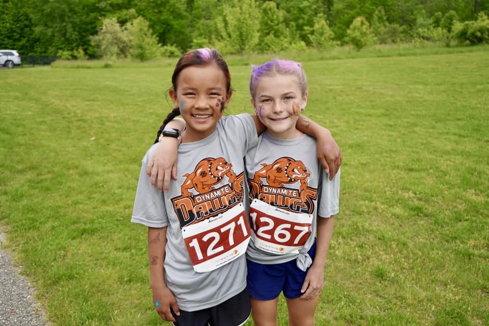 Two Brown Elementary students pose for a photo before their race at the 2024 Dynamite Dawgs run.