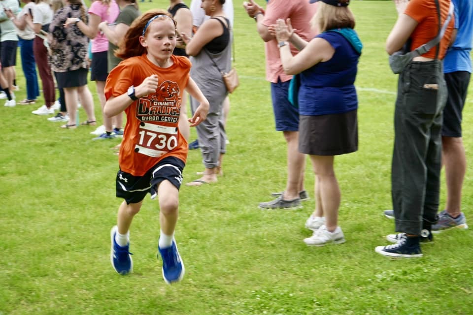 A Marshall Elementary student is a few steps away from crossing the finish line at the 2024 Dynamite Dawgs run.